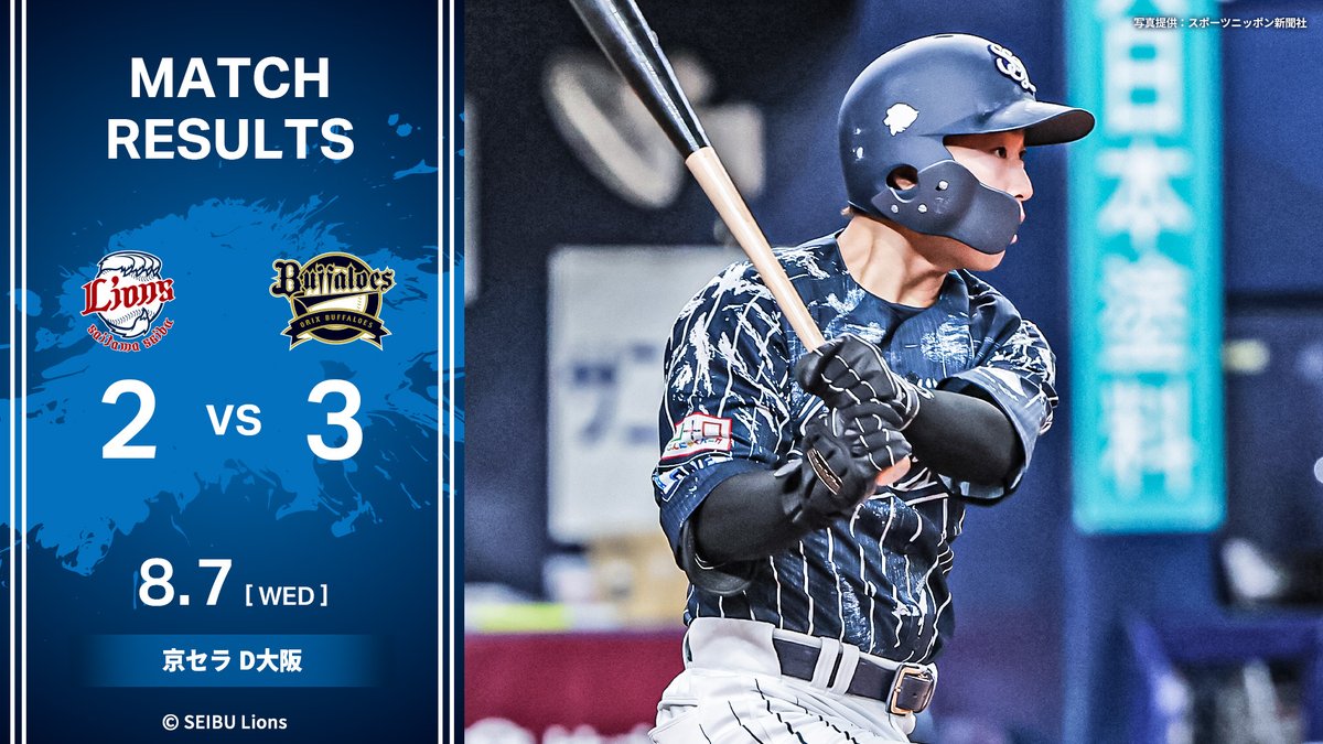 [8/7結果]L2-3B4回に#山村崇嘉選手の適時二塁打で2点を先制。しかし、その後追いつかれ勝ち越しを許します。3番手の#ボー投手が無失点に抑えますが、最後まで追いつくことはできませんでした。#埼玉..