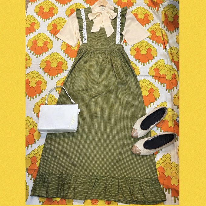 ○通販可能○70'sonepieceお色味はオリーブですドット柄が可愛いです白レースとおリボンが乙女心をくすぐりますお背中おボタンもポイントです※品質表示なしおそらくコットン※裏地なし※シミプチコショ..