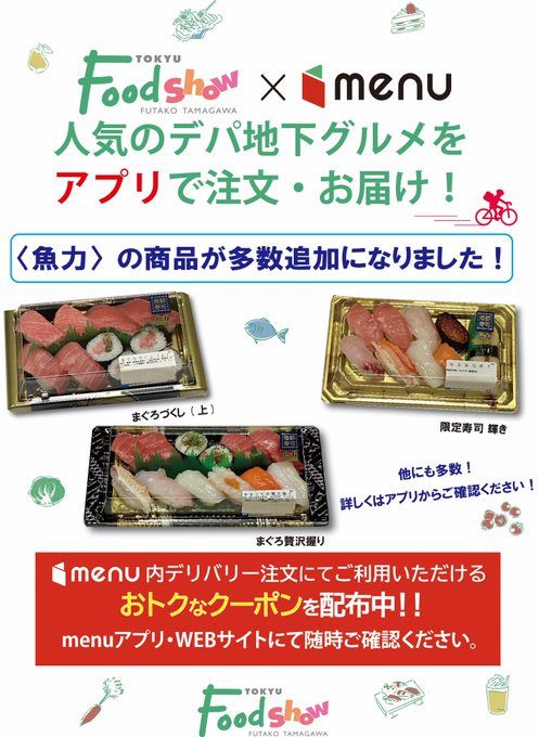 二子玉川東急フードショーのデリバリーサービス、menuにて〈#魚力〉の商品が多数追加になりました画像の商品以外にも美味しそうなお寿司がたくさん詳しくはmenuアプリからご確認ください※売り切れの際はご..