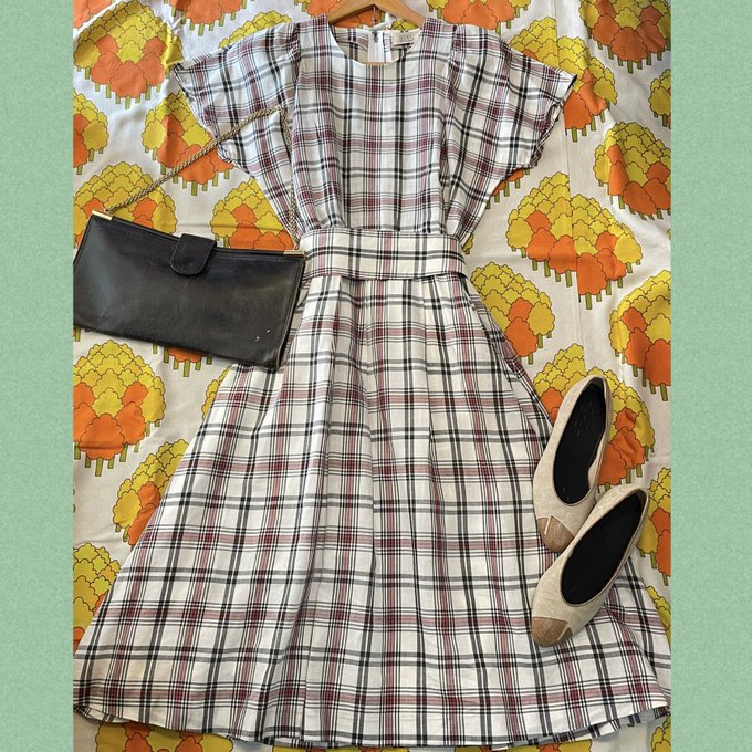 ◎通販可能◎ 80's onepiece お色味は白です クロとアカのタータンチェックが可愛い 袖切替えとドルマンスリーブで乙女チックなデザイン 腰のおリボンがとってもキュートです ※綿50麻50 ※ウエストおリボンあり プチコション本店