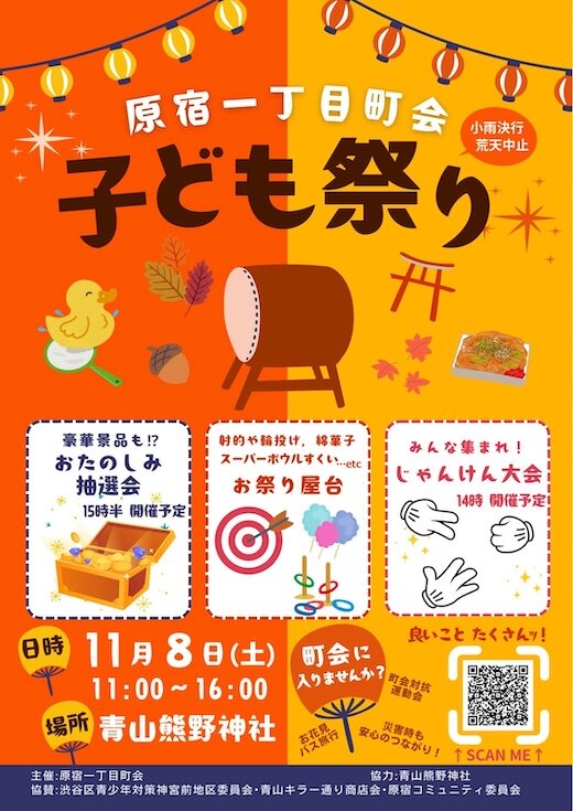 原宿一丁目町会 子ども祭り 日時:令和7年11月8日(土)11:00〜16:00場所:青山熊野神社 ・お楽しみ抽選会(15時半開催予定)・お祭り屋台・じゃんけん大会(14時開催予定) 主催:原宿一丁