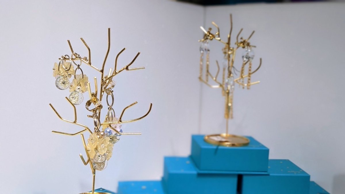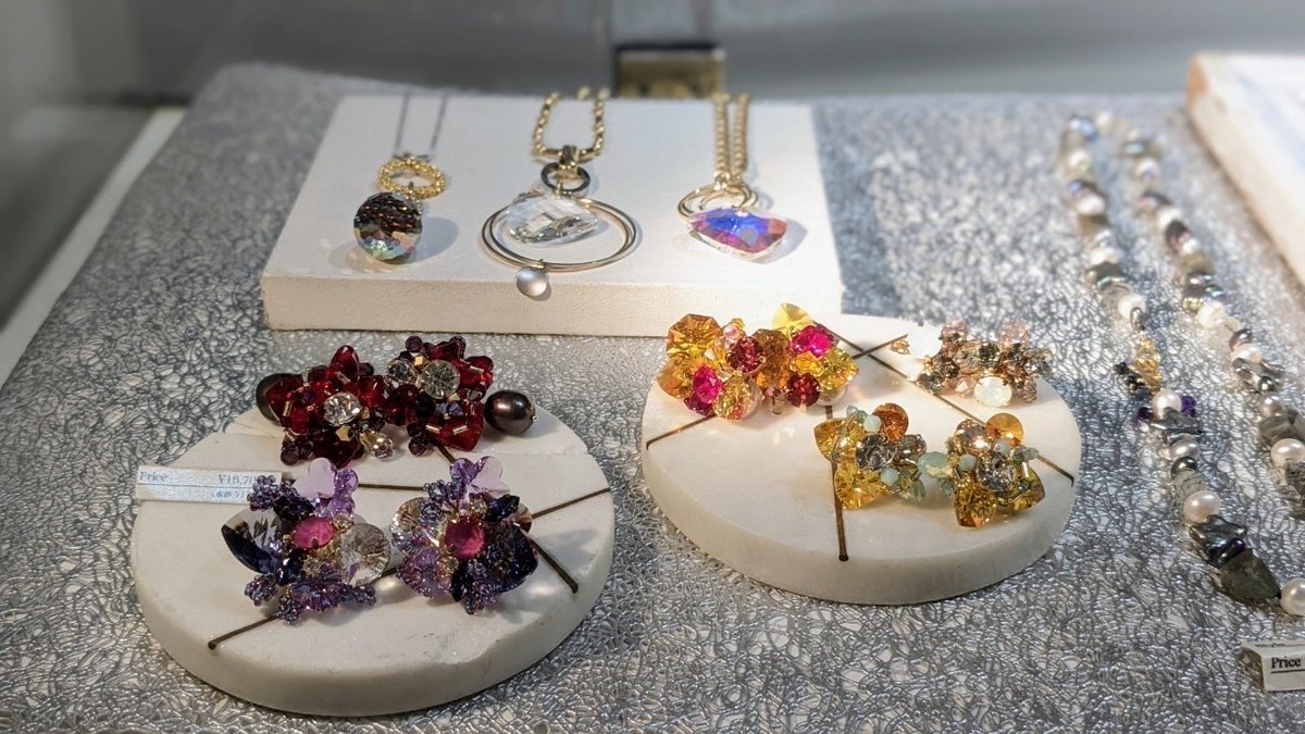 K10のオリジナルフープに天然石を編み込んだジュエリーシリーズや、クリスタルガラスを編みあげて作るブローチ、イヤーカフなど、個性溢れるアクセサリーをご紹介💎