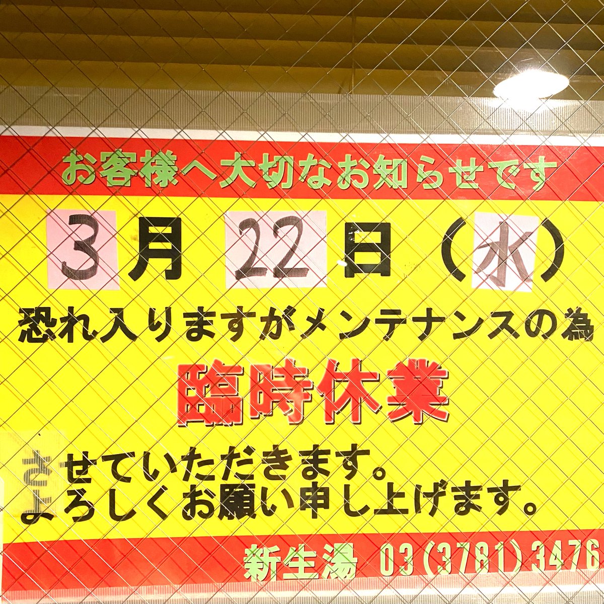 有難うございます品川旗の台新生湯です^_^東京雨☂️現在弱いですが風が強いですね🌀💧今日は春の嵐のようです💦🟢本日(金)通常営業15:30~op♨️天気イマイチですが皆さん楽しんで下さい😊🔴来週4月1..