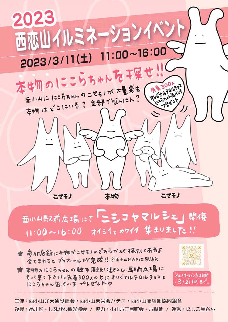 【西恋山イルミネーションイベント】駅前広場での「西小山イルミネーション」の開催に合わせ、西小山のキャラクター『にこらちゃん』を探すまち巡りイベントや、駅前広場でのマルシェが開催されます。www.mic..