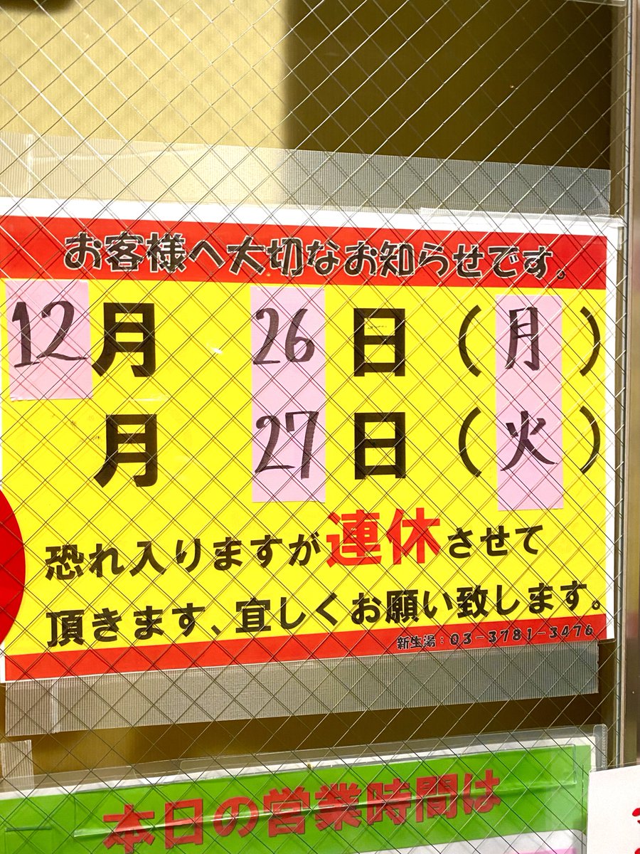 有難うございます旗の台新生湯です^_^東京も乾いた空気が肌に刺すような寒さです🥶全国的なクリスマス寒波皆さんご注意を💧☺️皆さんゆず湯🍊お入りになりましたでしょうか⁉️🟢本日(金)15:30~寒中お風..
