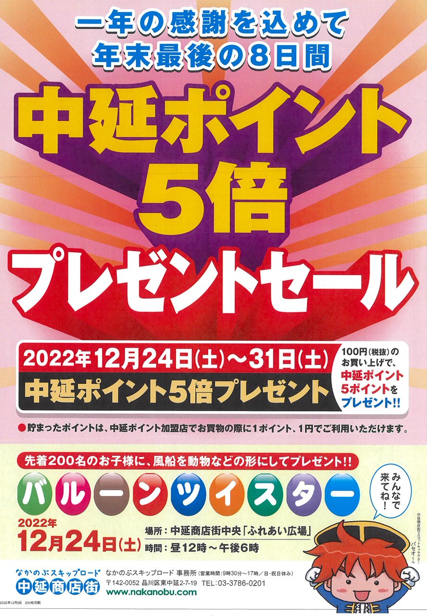 12月24日(土)から31日(土)まで、中延ポイント5倍プレゼントセールを開催❗️さらに24日は、ふれあい広場にて先着200名のお子様にバルーンツイスターをプレゼント❗️😆ぜひこの機会に商店街にお買い..