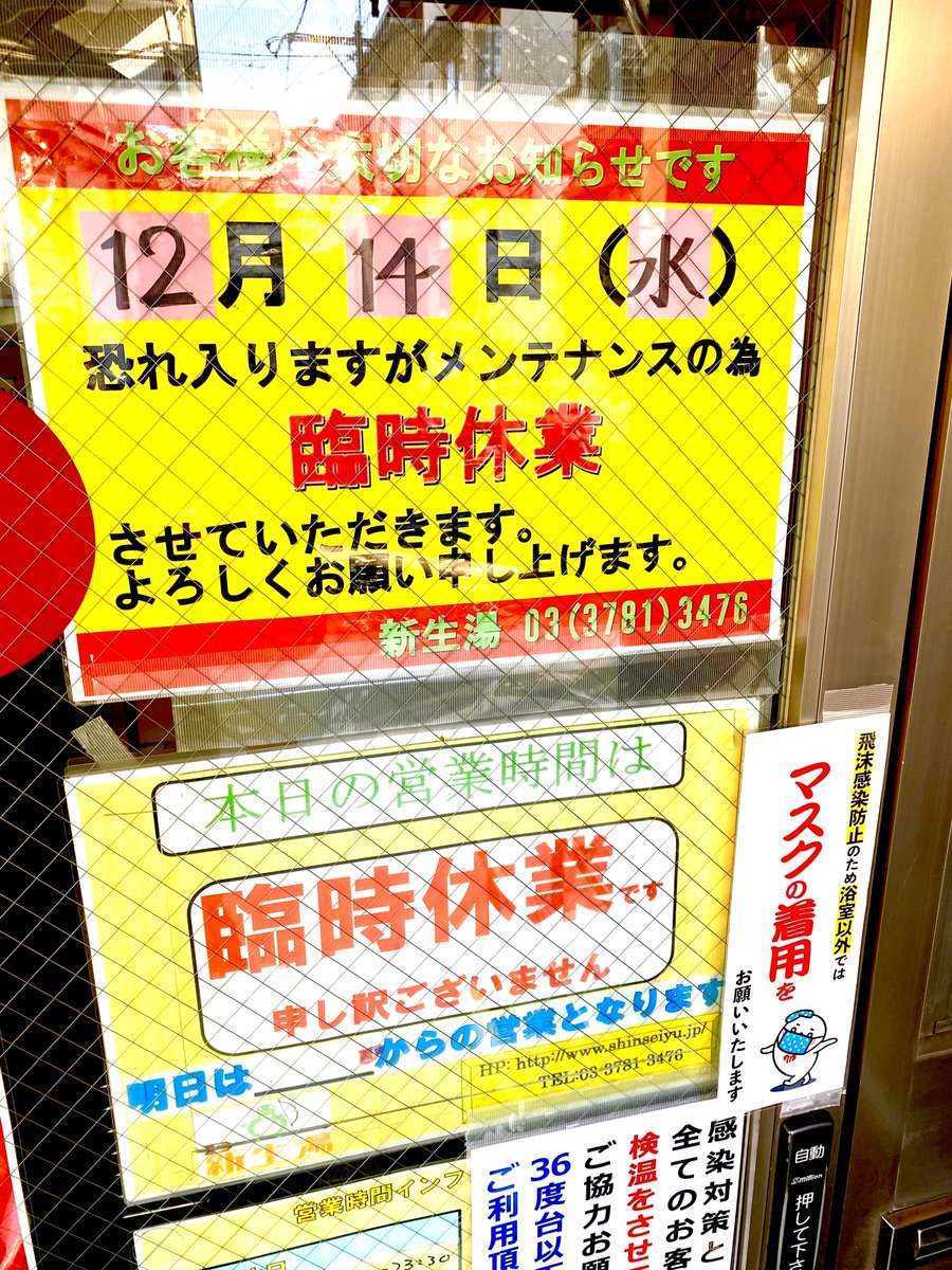有難うございます品川旗の台新生湯です^_^東京お昼前良く晴れてます☀️ワールドカップ⚽️クロアチア残念でしたね💧🔴お伝えのように本日14日(水)恐縮ですが施設内社内利用の為臨時休業頂きます🙇♀️周辺..