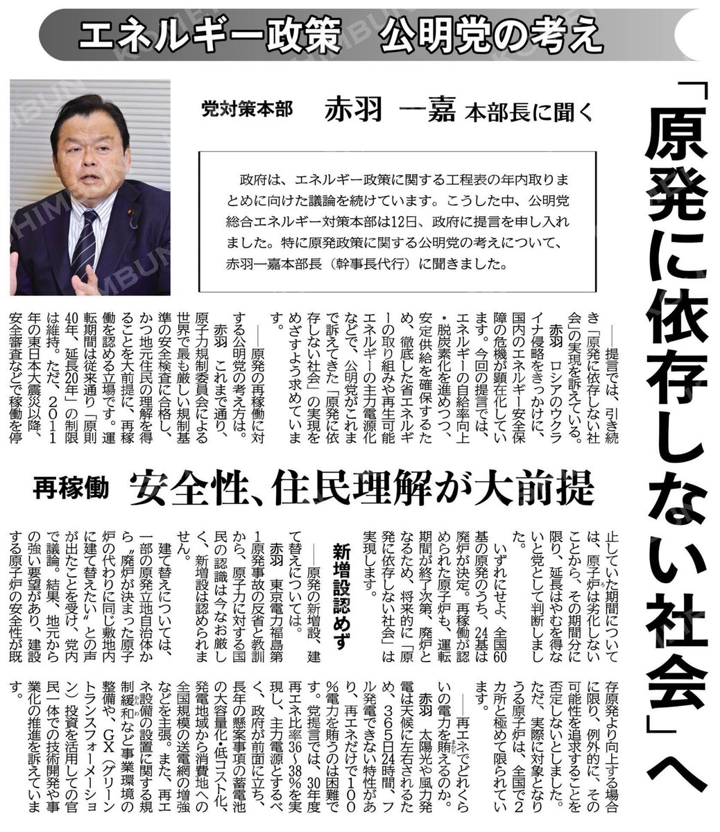 (エネルギー政策に関する公明党の考え) 「原発に依存しない社会」へ‼️ 再稼働は安全性、住民理解が大前提/赤羽一嘉党対策本部本部長に聞く #公明新聞電子版 2022年12月14日付