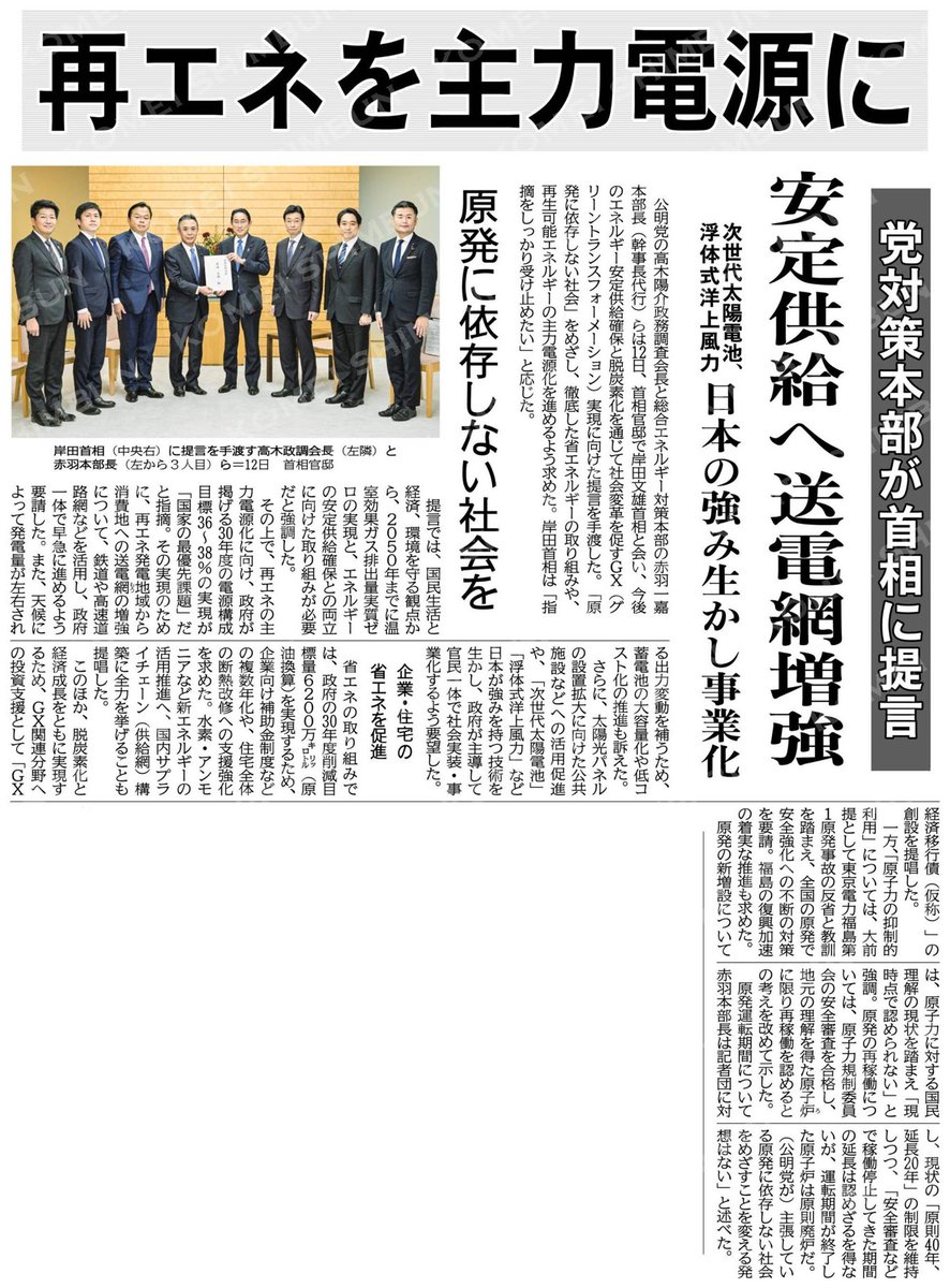 ◼️再エネを主力電源に‼️安定供給へ送電網増強/党対策本部が首相に提言#公明新聞電子版2022年12月13日付0214