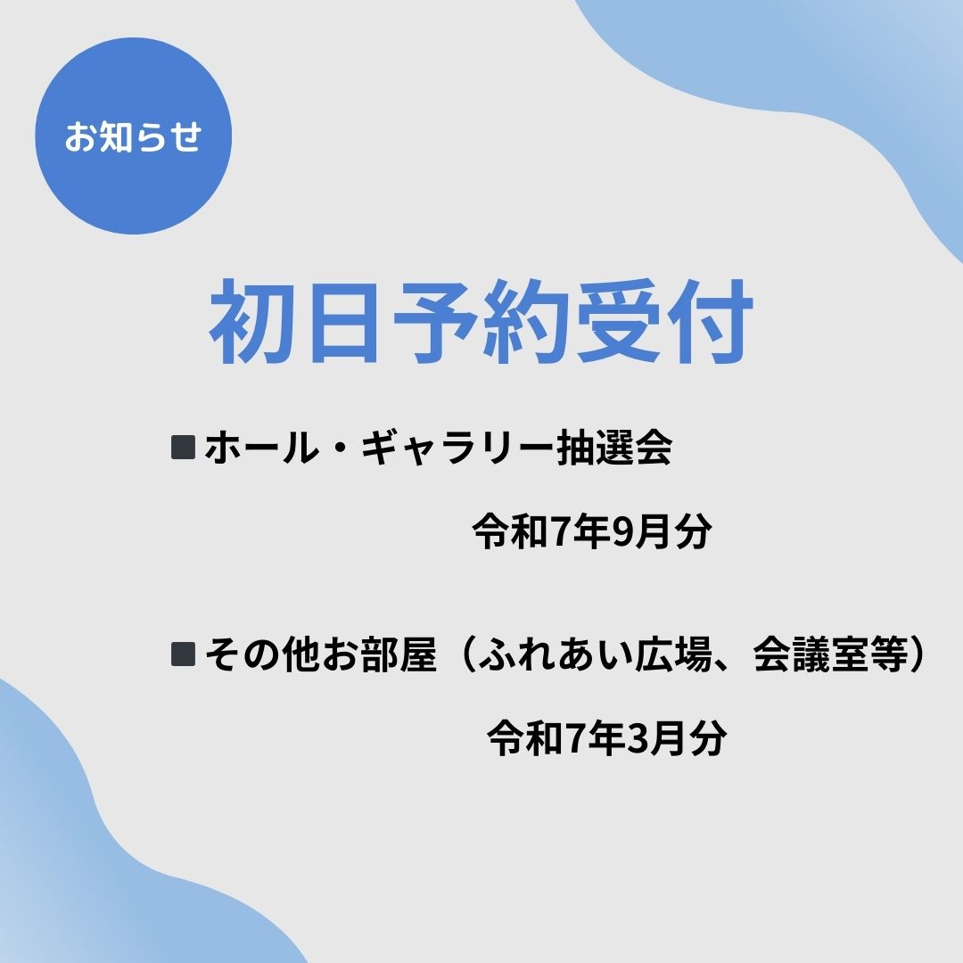 【初日予約受付】9月1日(日)ホール・ギャラリー9:30~2025年9月その他の部屋(ふれあい広場・会議室等)9:00~2025年3月のご予約受付開始となります。開館は8:45でございます。優先予約等..