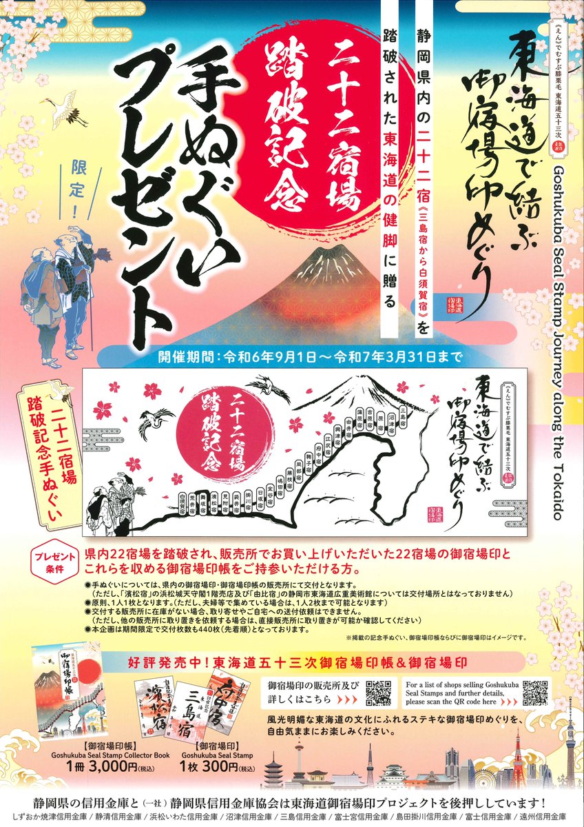 【東海道で結ぶ御宿場印巡り】静岡県内の22宿全て踏破すると、その証として記念手ぬぐいをプレゼント御宿場印帳と22の御宿場印をご持参の方に、御宿場印の販売所で9/1から手ぬぐいを交付します。※ただし浜松..