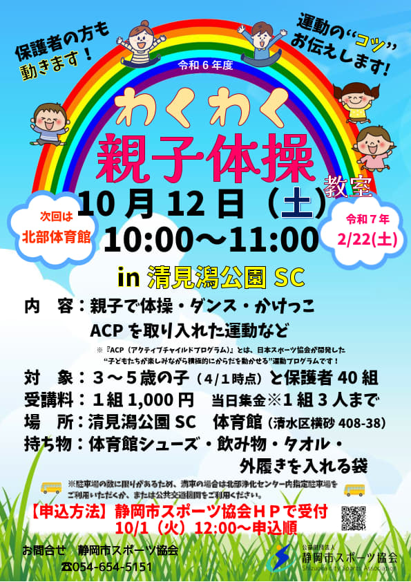 本日10/1(火)12:00からわくわく親子体操教室の募集が始まります!今回は清見潟公園スポーツセンターで開催します下記専用フォームからお申し込みくださいhttps://shizuoka-sports..