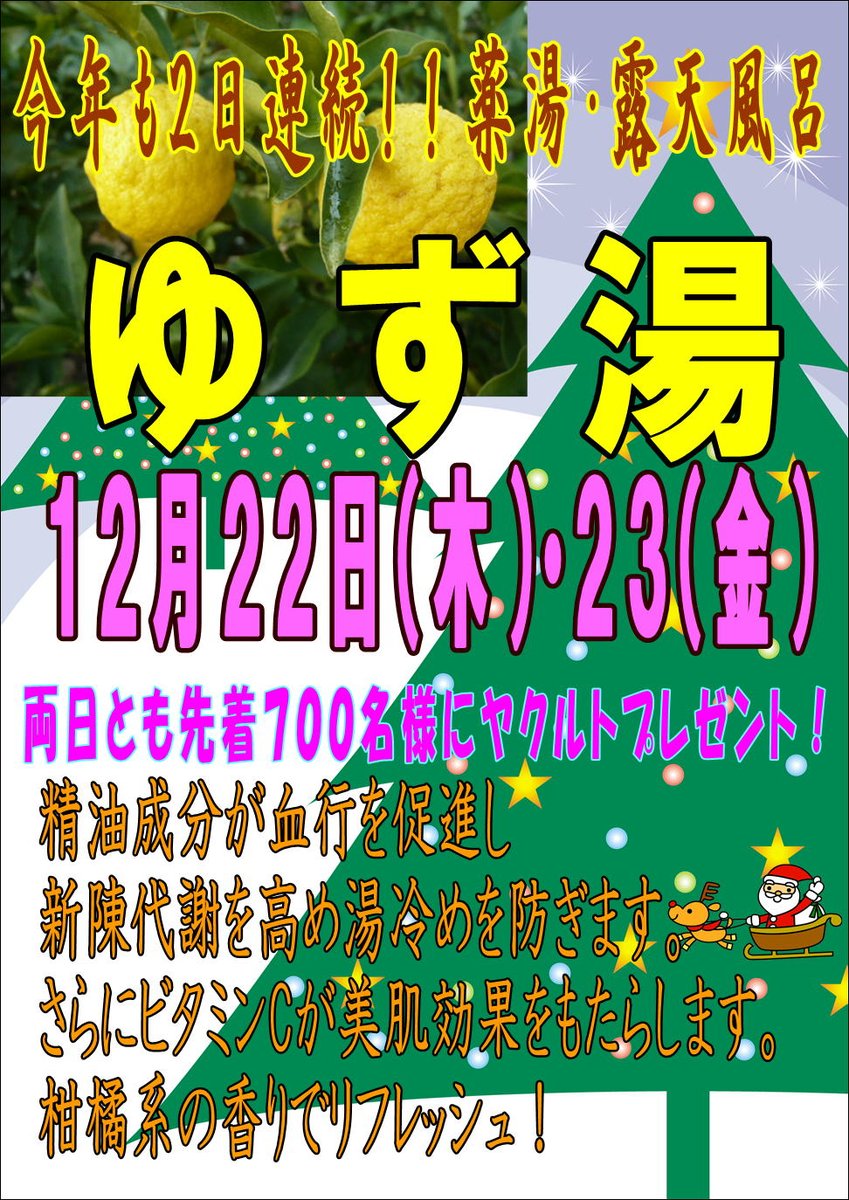 本日は冬至⛄“ゆず湯に入って、運を呼びこむ前に厄払いするための禊(みそぎ)をしよう” 「ゆず湯🍊」※両日とも先着700名様にヤクルトプレゼント~0215