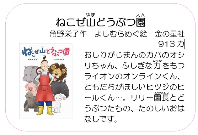 リスト「子どものほん2024~1・2年生~」からピックアップ📔図書館員おすすめ✨2023年出版の本を中心に紹介するリストです😁市内図書館で配布中!『ねこぜ山どうぶつ園』(角野栄子作 よしむらめぐ絵 #..