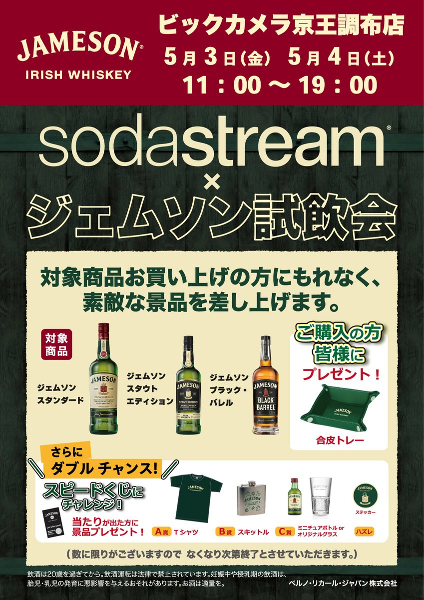 §(*'▽'o[イベント]osodastream×JAMESON5/3~4日の2日間限定ビックカメラ京王調布店1F店頭特設会場では、ウイスキーJAMESON(ジェムソン)の試飲会を開催いたします🥃今回..