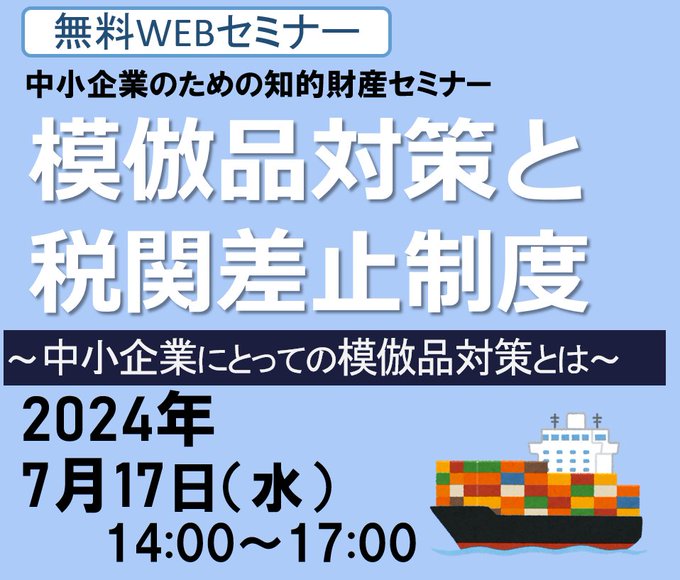 /模倣品対策と税関差止制度セミナー開催迫る!\申込期限は7/16(火)正午まで関税協会から講師をお招きする特別編#税関の活用方法や#模倣品対策のポイントについて聞いてみましょう#オンライン開催です#無..