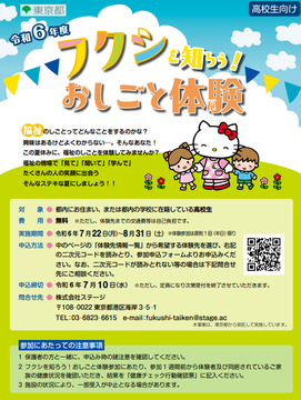 【締切間近!参加者募集中!】都内在住、在学の#高校生のみなさん!夏休みは福祉の#職場体験をしてみませんか?一人1回まで、無料で福祉のおしごと体験ができます♪7月10日(水)まで申込受付中です!迷ってい..