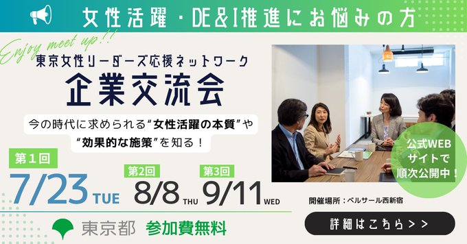 【東京女性リーダーズ応援ネットワーク】今の時代に求められる#女性活躍の本質や、他社の取組を知ることができる#企業交流会の参加受付中です第1回:7/23(火)13:30~16:00@ベルサール西新宿(参..