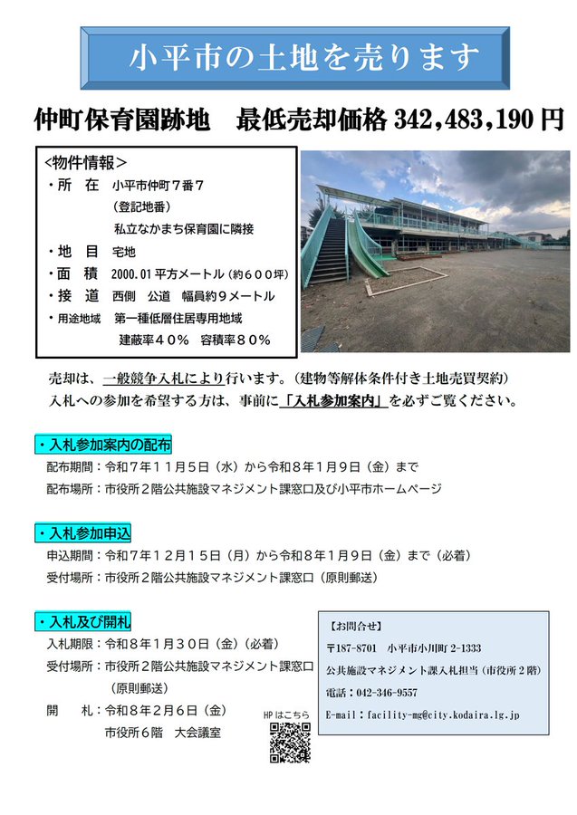 【一般競争入札 市の土地を売却】 ▷売却物件 所在 仲町7-7 ▷申込み 12月15日(月)から令和8年1月9日(金)までの平日の午前8時30分から午後5時まで(必着)に、申込み書類を問合せ先へ(原則送付) 詳しくは→ https://city.kodaira.tokyo.jp/kurashi/124/124148.html… 問合せ 公共施設マネジメント課042(346)9557