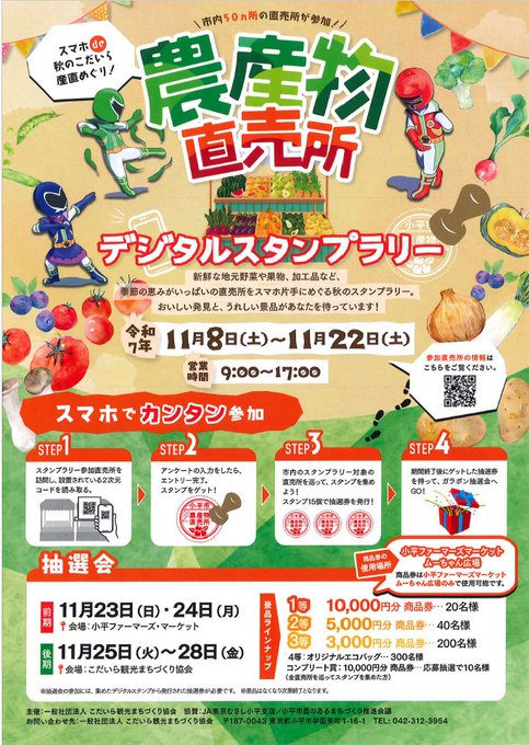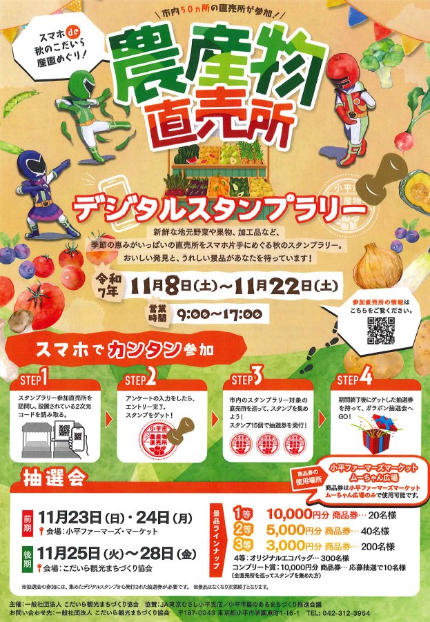 スマホde秋のこだいら産直めぐり!農産物直売所デジタルスタンプラリー新鮮な地元野菜や果物、加工品など、季節の恵みがいっぱいの直売所をスマホ片手にめぐる秋のスタンプラリー。おいしい発見と、うれしい景品が..
