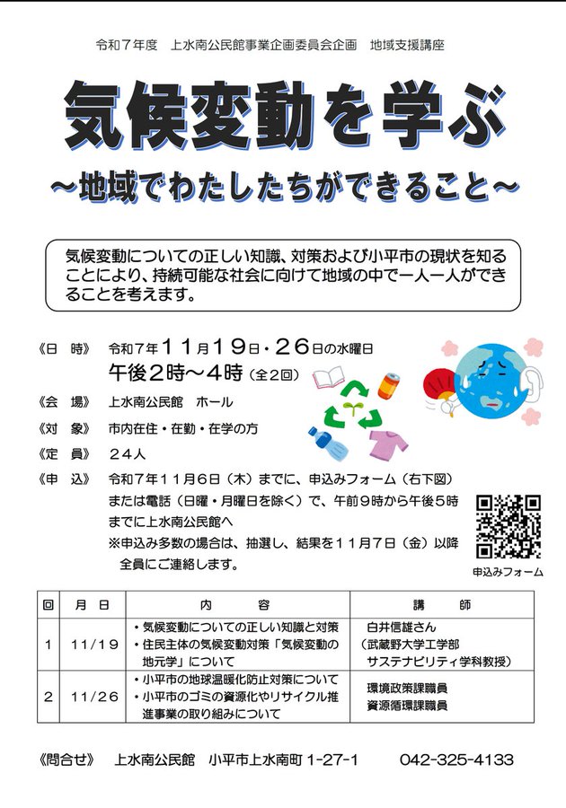 【受講者募集中】気候変動を学ぶ~地域でわたしたちができること~ゲリラ豪雨や猛暑日の増加など、私たちの生活に影響を及ぼす気候変動について学びます。日程11月19日・26日の水曜日午後2時~4時(全2回)..