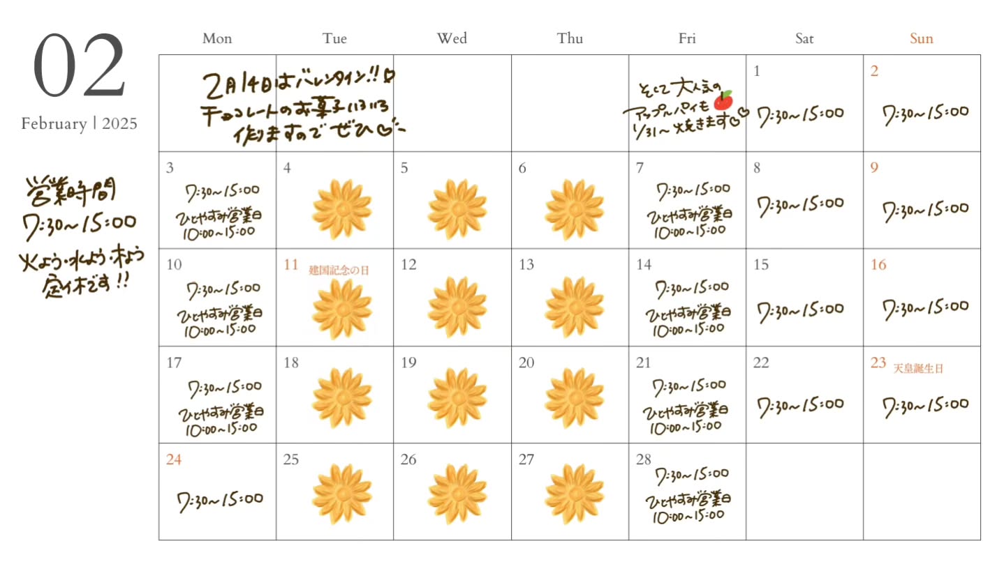 ..2月の営業スケジュールです🍫チョコレートのお菓子が増えますよ~♡そしてアップルパイは2月中たくさん出ます!🍎お楽しみに❤️
