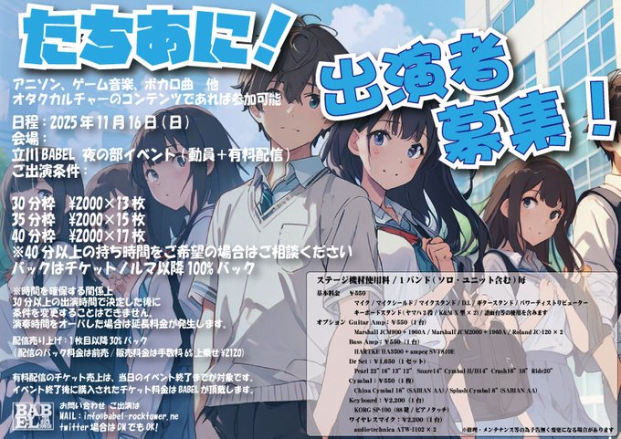 アニソンコピーバンド募集!日程:2025年11月16日(日)ご出演条件:アニソン、ゲーム音楽、ボカロ曲他オタクカルチャーのコンテンツであれば参加可能その他詳細は画像をご覧ください!お問い合わせ、ご出演..