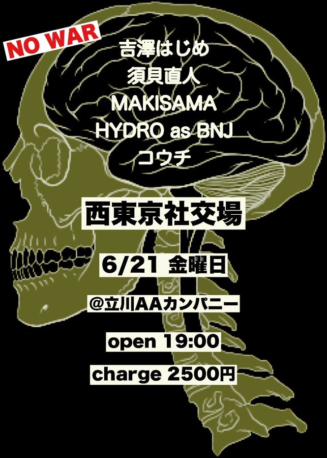 new 6/21 (金) 西東京社交場 open 19:30 charge 2500yen + 1D 吉澤はじめ 須貝直人 MAKISAMA HYDRO as BNJ コウチ