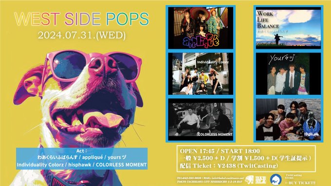 7/31(水)[WESTSIDEPOPS]出演:わあくらいふばらんす/appliqué/yoursヅ/IndividualityColorz/hisphawk/COLORLESSMOMENTOpen1..