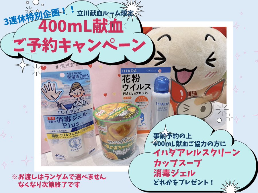 // 明日からの特別企画!! \\ 立川献血ルーム限定 事前予約のうえ400mL献血にご協力いただいた方に画像の3点のうちおひとつをランダムでプレゼント!! ご予約はラブラッドから 直近のご予約はお電話でも承ります