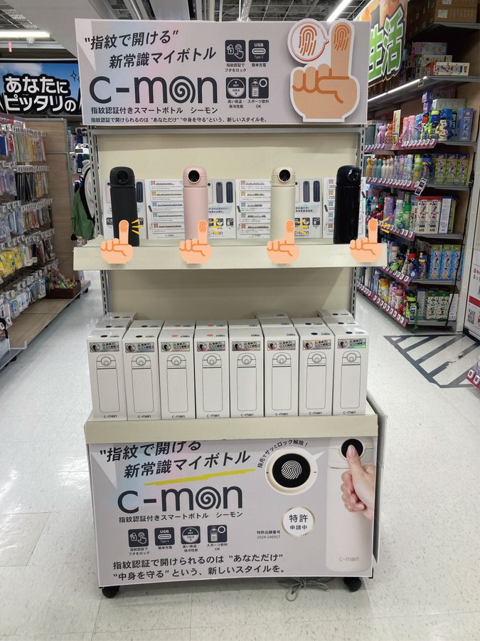 指紋で開ける新常識マイボトルc-mon(シーモン)が入荷致しました指紋認証で開けられるのは貴方だけキャップと、ボトル本体もロックするWロック構造でこじ開けも阻止。保温、保冷両方出来て、一年中使えます6..