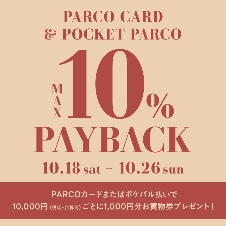 [本日から]PARCOCARD&POCKETPARCOMAX10%PAYBACKPARCOカードまたはポケパル払い決済にて10,000円(税込・合算可)で1,000円分お買物券プレゼント!10..