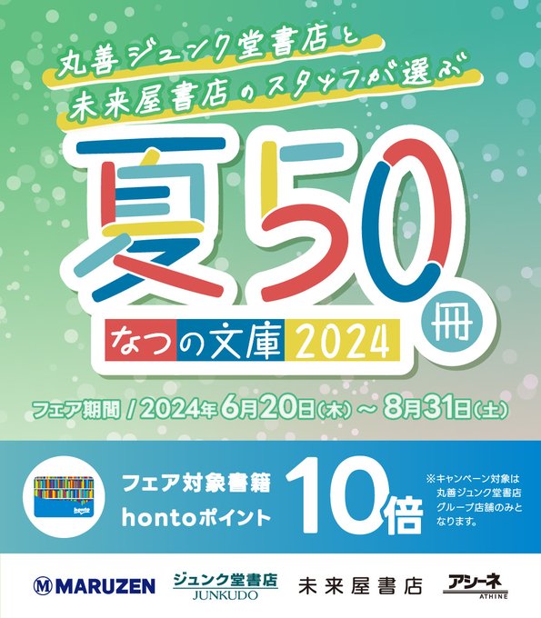 【夏の文庫50冊】6/20~8/31の期間、丸善ジュンク堂書店と未来屋書店のスタッフがオススメする選りすぐりの50冊を集めた夏の文庫フェアを開催中!対象書籍をお買い上げでhontoポイントが10倍にな..