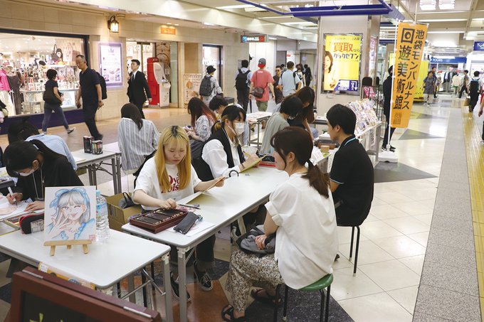 「#池袋の街のどこもが美術館」をテーマに開催されている地域のアートイベント『#池袋モンパルナス回遊美術館』#東武ホープセンターでは地下公道にて#立教大学#漫画研究会による#似顔絵描き•作品販売を5/2..