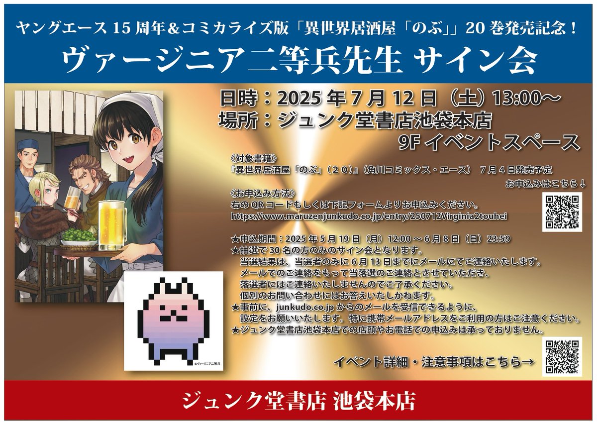 本日申込締切!【ヤングエース15周年&コミカライズ版「異世界居酒屋「のぶ」」20巻発売記念!ヴァージニア二等兵先生サイン会開催決定】日時:7/12(土)場所:当店9階イベントスペース申込方法:下記HP..