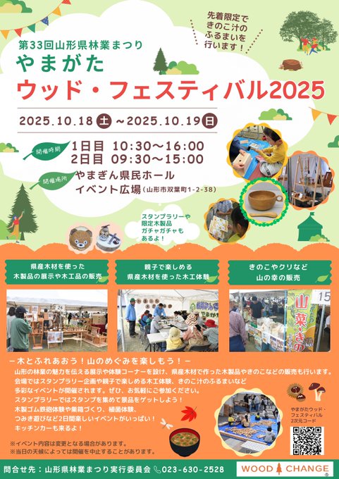 【ウッド・フェスティバル2025開催】10月18日(土)、19(日)の2日間、やまぎん県民ホールイベント広場においてウッド・フェスティバル2025(第33回山形県林業まつり)を開催します林業の魅力を伝..