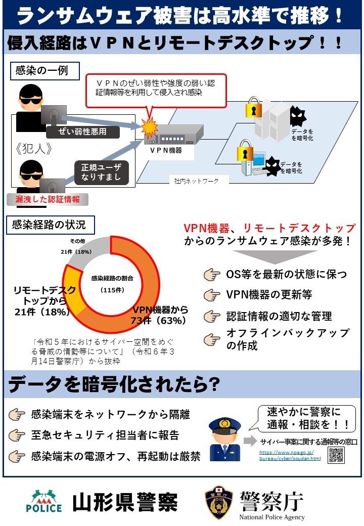 【#ランサムウェア被害は高水準で推移!】近年、業種や規模を問わず様々な企業がランサムウェア被害を受けています。#OSを最新の状態に保つなどの対策を講じて、もし#感染が確認されたら、感染端末を#ネットワ..
