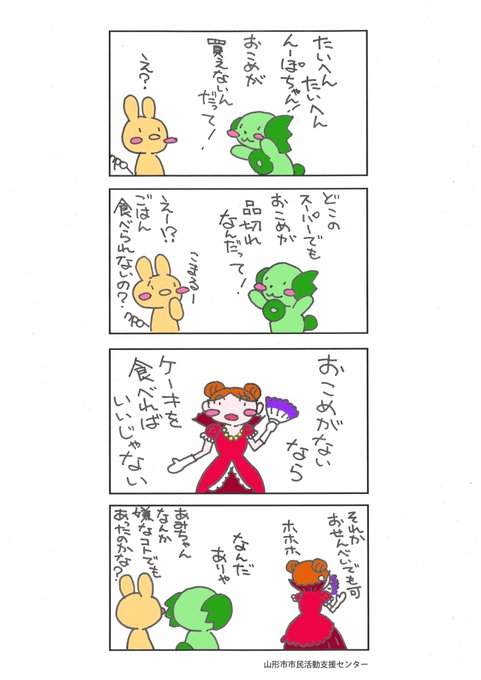 今朝のニュースでは、おせんべいですら品薄だとか。#マンガが読めるハッシュタグ#4コママンガ#NPO#ふらっとふれんず#ふらっとふれんずとなかまたちhttps://yamagata-npo.jp/fri..