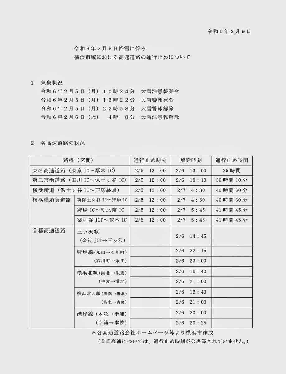 令和6年2月5日の降雪に係る、横浜市域における高速道路の通行止めについて当局に資料要求しました。最長は横浜横須賀道路(狩場IC〜朝比奈IC、釜利谷JCT〜並木IC)の41時間45分でした。雪は夜半から..