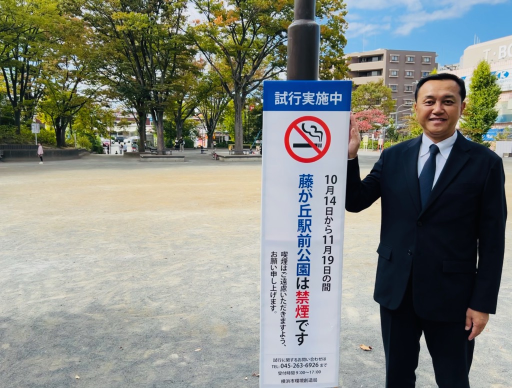 現在「禁煙」となっている藤が丘駅前公園へ。市内5か所の公園で11/19まで試行中。今後、公園のあり方を決めていきます。たばこを吸う、吸わないは個人の自由ですが、昨日も沢山の子ども達が遊んでいました。「..
