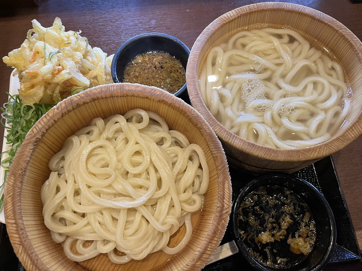 【今日の昼飯】今日は「釜揚げうどんの日」ということで、お昼はうどんにしました。釜揚げ(小)のお湯あり(170円)+釜揚げ(小)お湯なし(170円)+温かいお出汁(0円)+冷たいお出汁(0円)+かき揚げ..