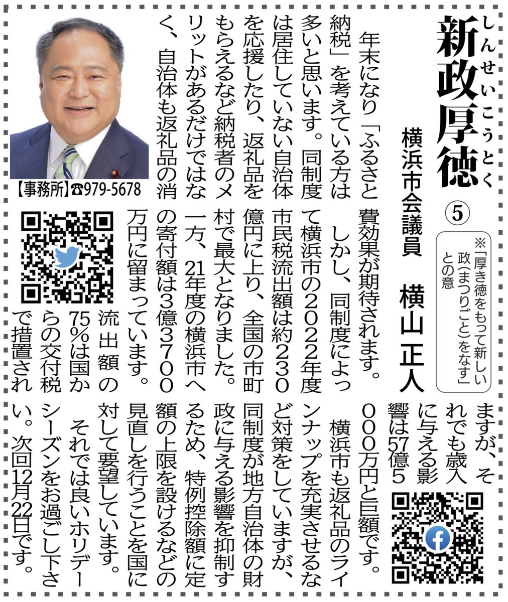 地元タウン紙へ毎月最終木曜日「月一コラム」を書いています。今日は「ふるさと納税」について書きました。ご笑覧ください。#横浜市#青葉区#新政厚徳#タウンニュース119