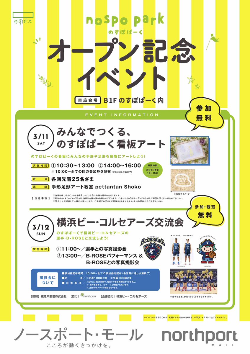 \本日開催/「のすぽぱーく」オープン記念イベント#ビーコル交流会開催🏴☠️🗓3/12(日)📍ノースポート・モールB1F「のすぽぱーく」⏰11:00~ #キング開選手&#松崎裕樹選手との写真撮..