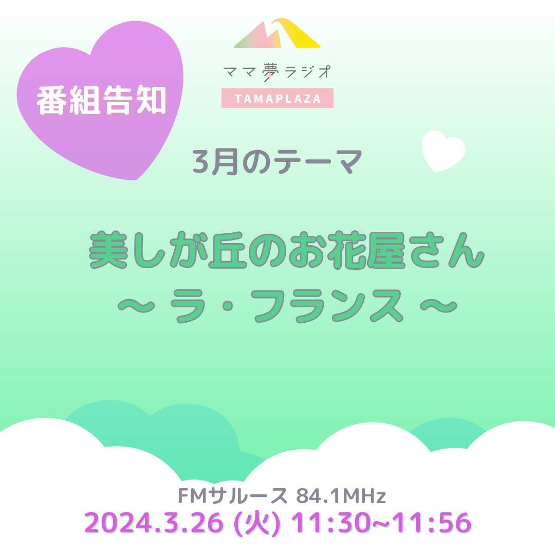 本日3月26日㈫11:30はいよいよママ夢ラジオ、本年度最後の放送日です💓今月のテーマは『美しが丘のお花屋さん〜ラ・フランス〜』2年間、番組の「カラフル」のコーナーで大変お世話になった、横浜..