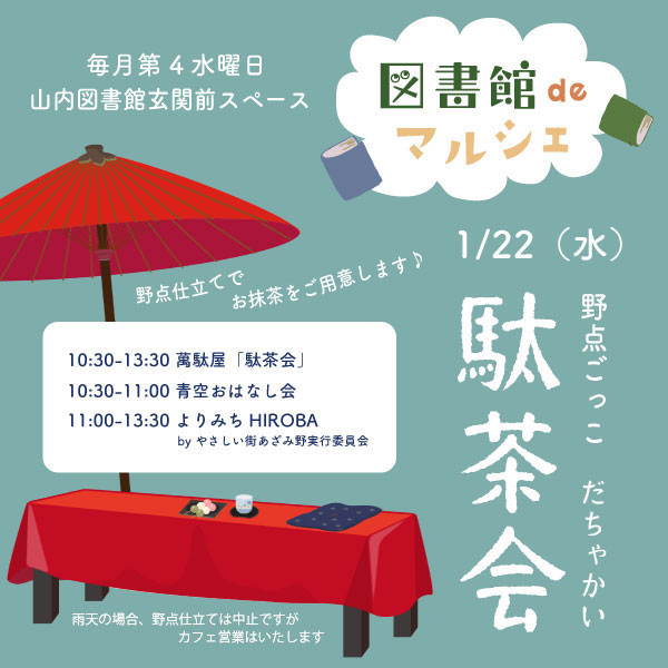 【1/22(水)明日は『駄茶会』@山内図書館前】毎月第4水曜日は山内図書館の玄関前スペースで「図書館deマルシェ」。今年最初の図書館deマルシェは、野点ごっこ『駄茶会』を開催します✨🍵✨お抹茶やら茶器..