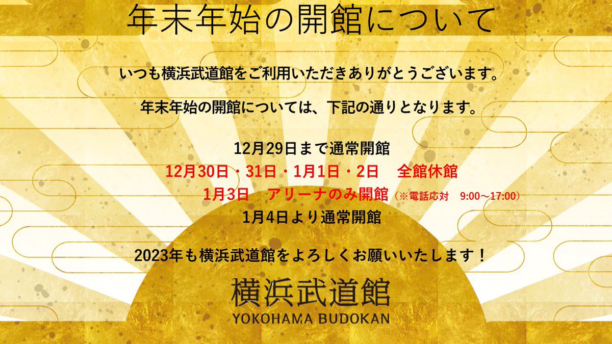 おはようございます! 本日12月29日、年内最終営業日となります! 今年1年大変お世話になりました🙇♂️ 年明けは1月3日のスターダムから始まり、1月4日より通常営業を開始いたします。#横浜武道館