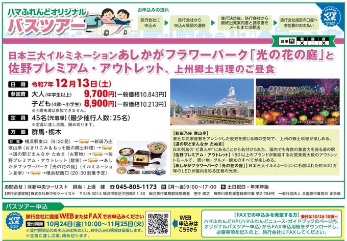 ハマふれ会員限定日帰りバスツアー12/13(土)実施「あしかがフラワーパーク光の花の庭イルミネーション」と佐野アウトレットで冬を満喫申込は本日10/24~11/25、定員に達し次第終了。お申込はWEB.. 続きを読む