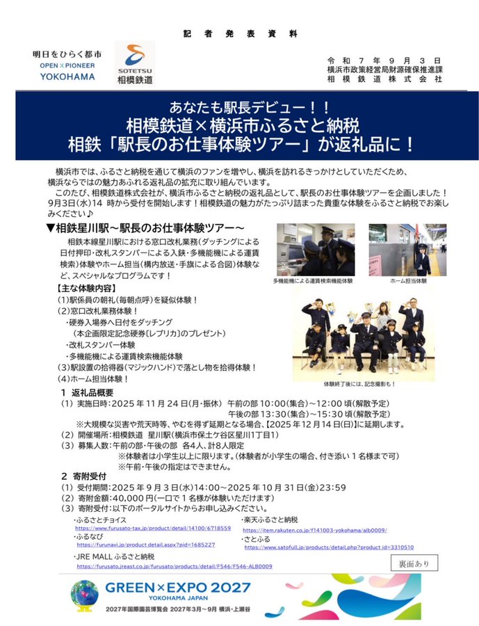横浜市では、ふるさと納税を通じて横浜の魅力を全国へ発信しています。 相模鉄道株式会社による「駅長のお仕事体験ツアー」が新たに返礼品となりました! 星川駅で、改札業務や構内放送、手旗合図など駅長の仕事を実際に体験いただける特別なプログラムです。