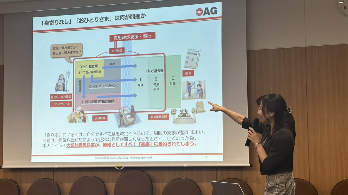 今日は株式会社OAGライフサポートの黒澤さんよりご講演いただき、頼れる身寄りのない方が安心して老後とその先を迎えるために、どのような支援が求められているかを勉強。他人事ではないこの問題に、行政がどう立..