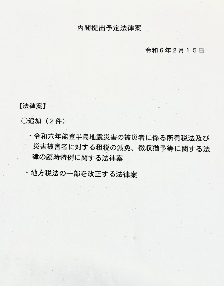 明日から確定申告がはじまりますが、能登半島地震の被災者の所得税(雑損控除特例)、災害減免法による減免措置特例を来週20日に行われる予定の衆議院本会議で成立させるよう提案しています。 また広く周知していきます。